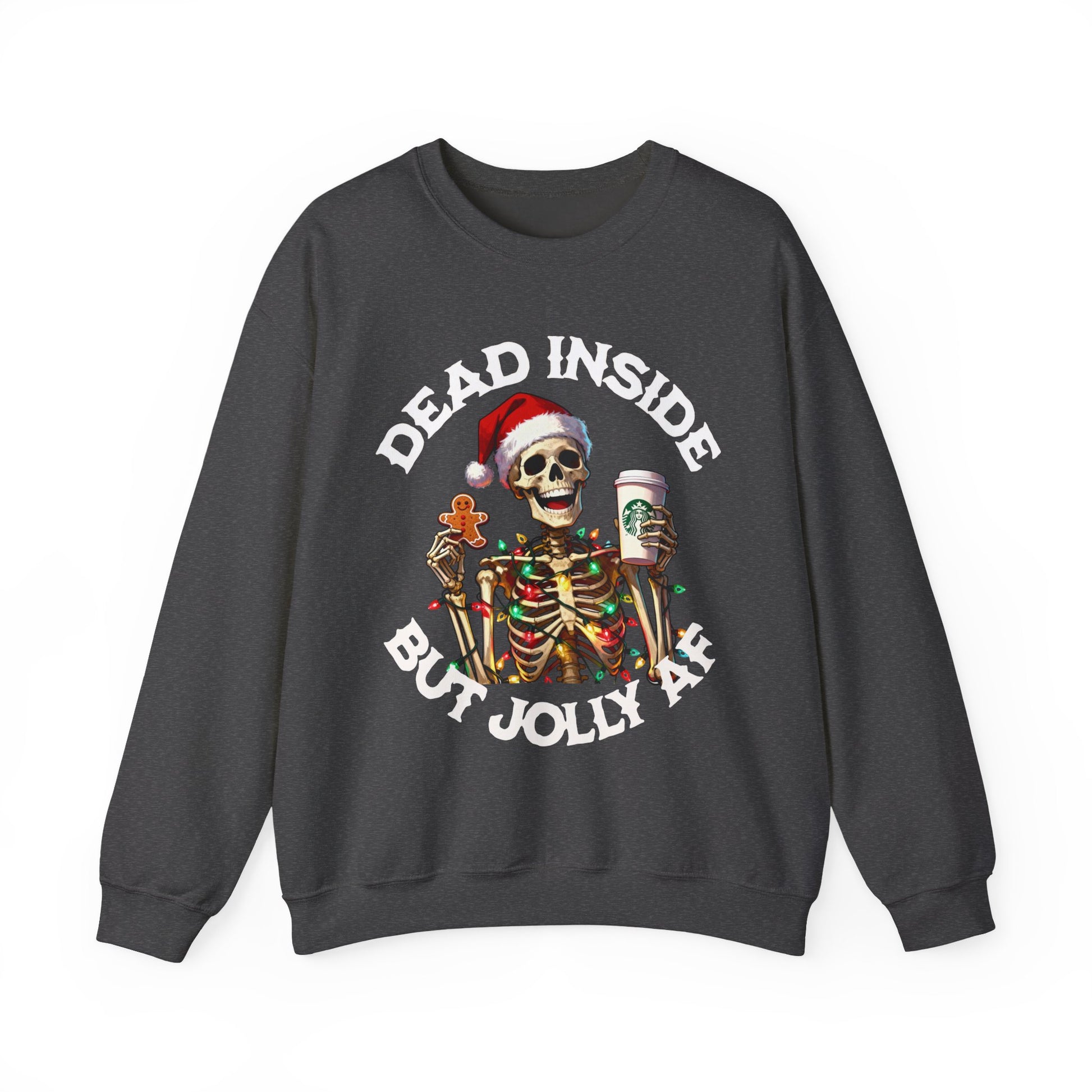 When your soul's tired but your holiday spirit still shows up. This funny Christmas sweatshirt features a holiday-loving skeleton wrapped in colorful Christmas lights, holding a steaming cup of coffee and a gingerbread cookie with the phrase "I'm dead inside, but jolly AF." It's the perfect blend of spooky humor and festive cheer - ideal for anyone who runs on caffeine, sarcasm, and seasonal chaos. Soft, cozy, and full of personality, this sweatshirt is great for lounging, gifting, or spreading (dark) holiday joy. Whether you're sipping hot cocoa, attending an ugly sweater party, or simply embracing your inner "tired but festive" mood, this is your go-to winter favorite!