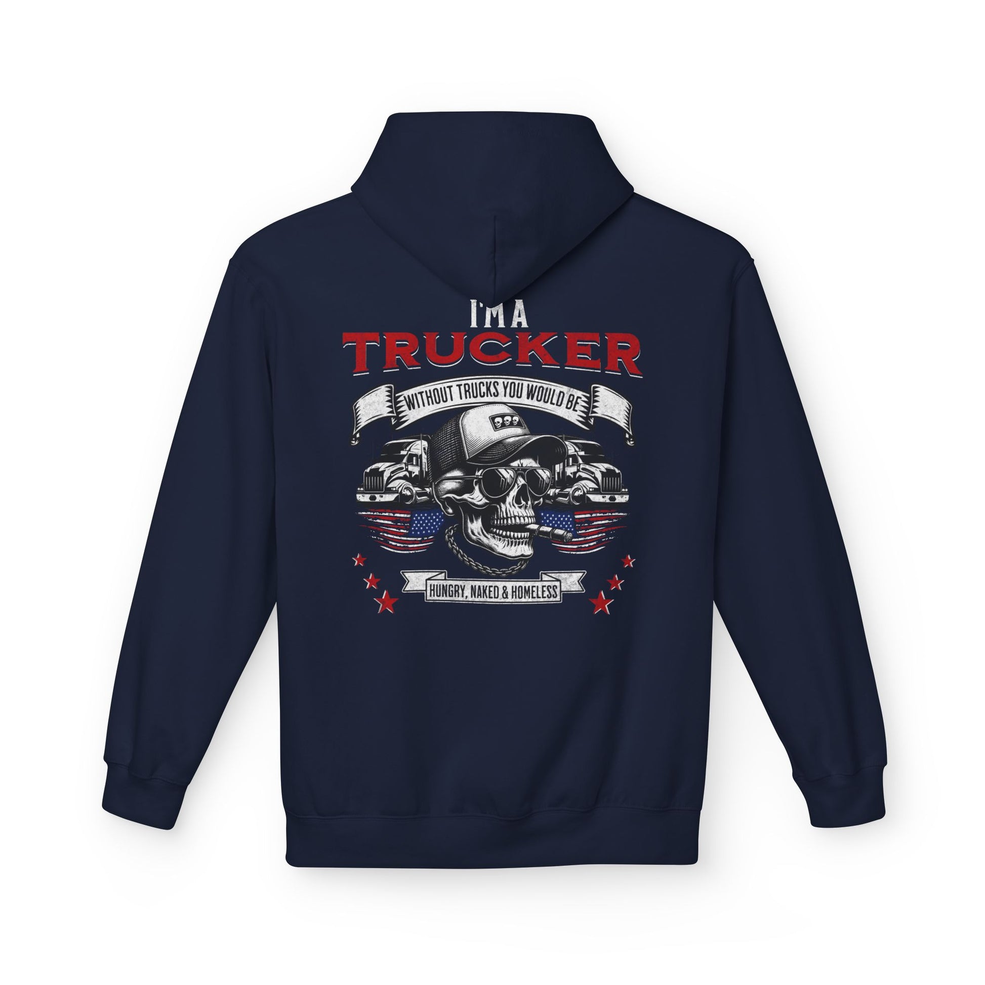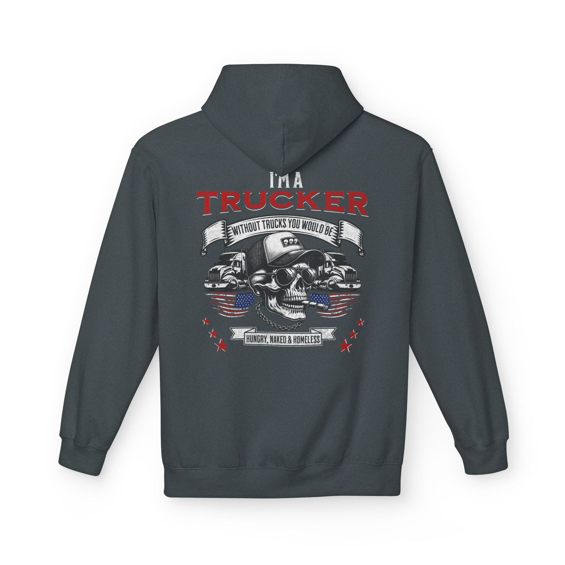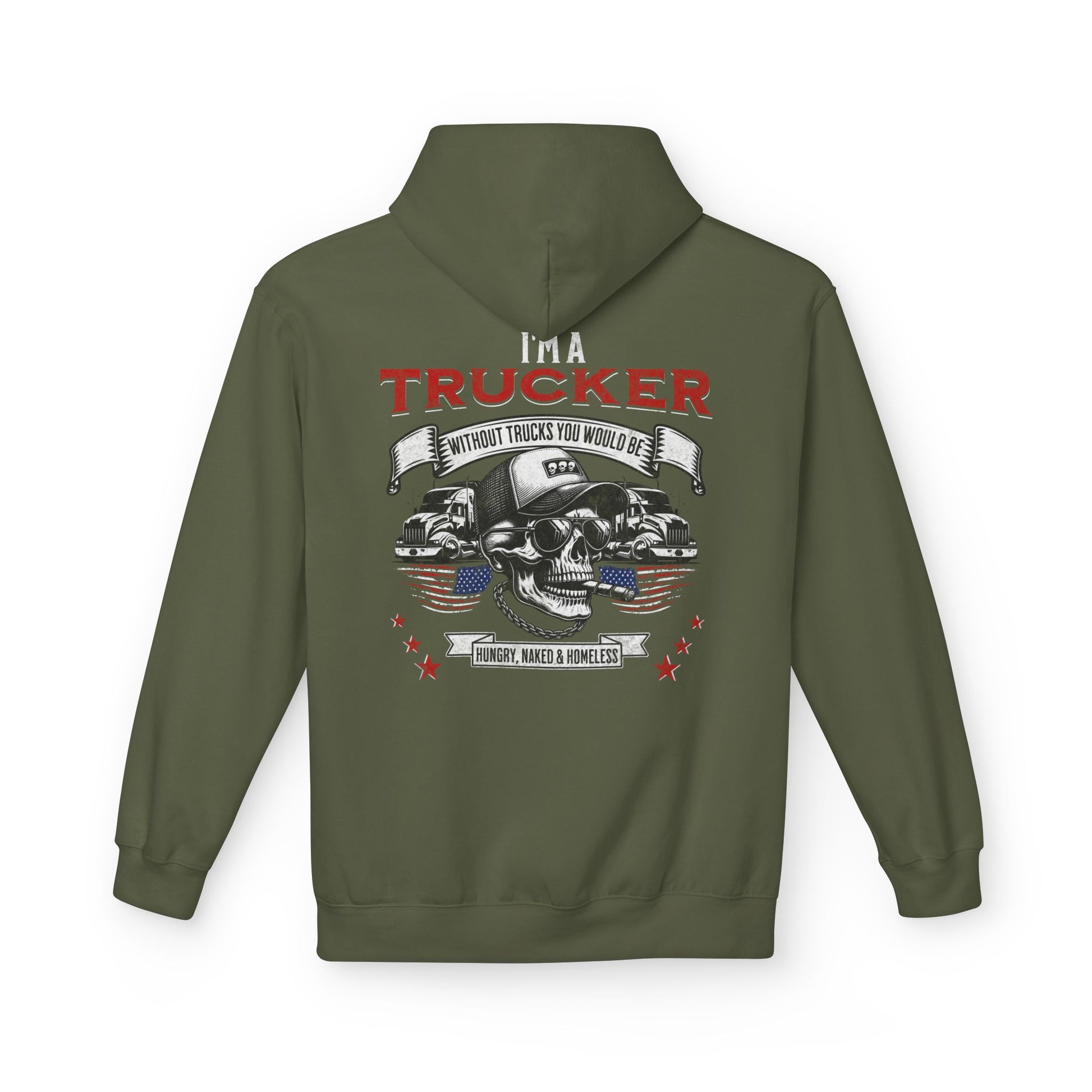 Show your trucker pride with this bold Unisex Trucker Hoodie! Featuring two big rig trucks and a skull rocking a trucker hat, this graphic hoodie carries the powerful message: "I'm a trucker. Without trucks you would be hungry, naked and homeless." Perfect for professional drivers and trucking enthusiasts, this hoodie celebrates the hard work and grit it takes to keep the world moving.